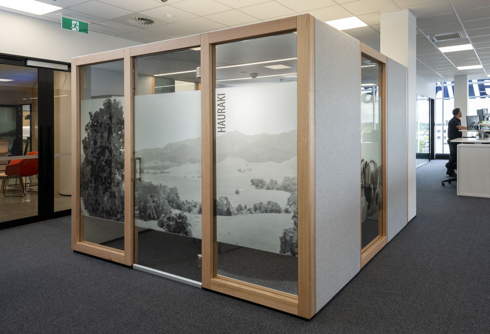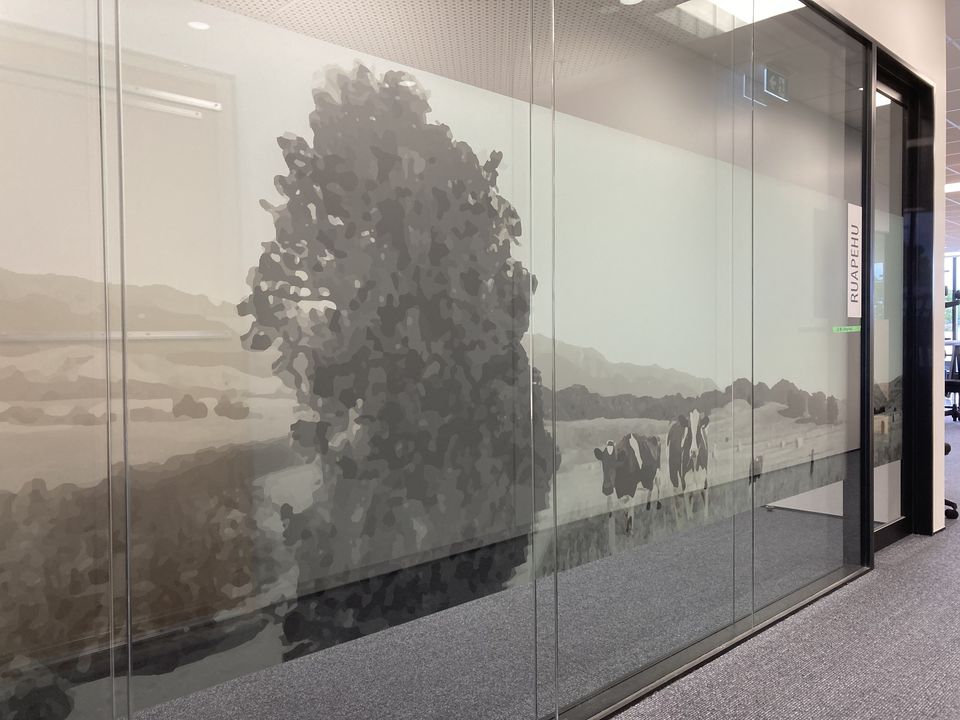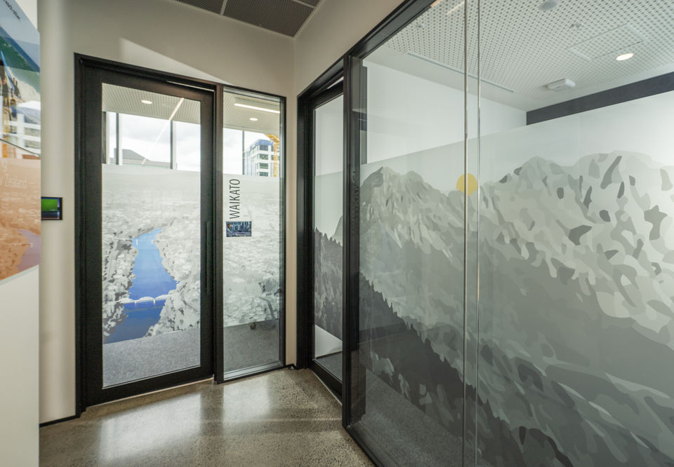 Privacy screens for meeting rooms were developed using a long panoramic monotone, landscape with different sections applied to different rooms.